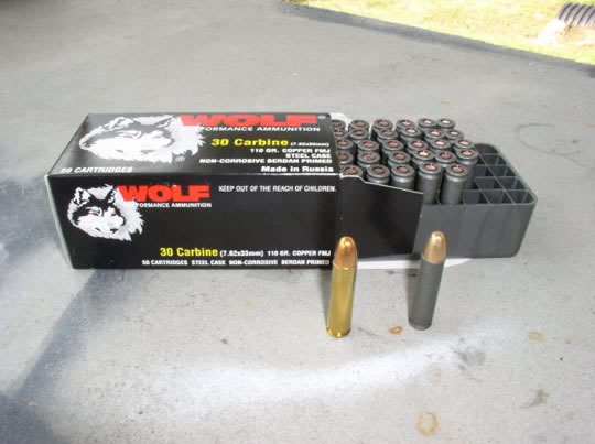“狼”牌弹药厂生产的.30卡宾枪弹,图中左边的为黄铜壳,右边为“狼”牌出名耐用、可靠和精度高的钢壳弹产品