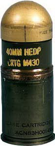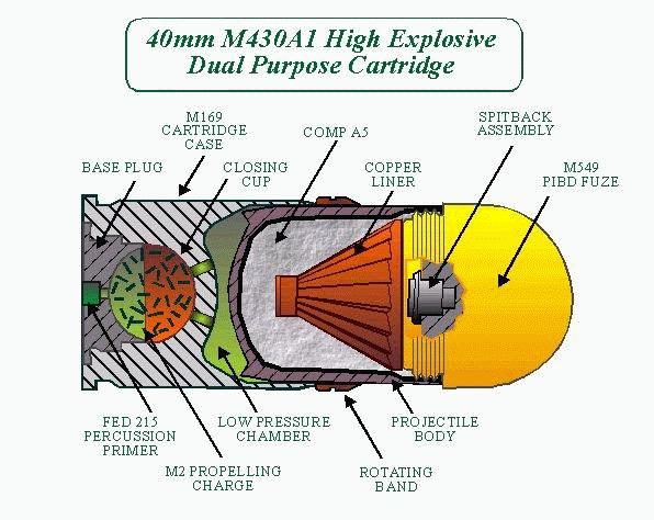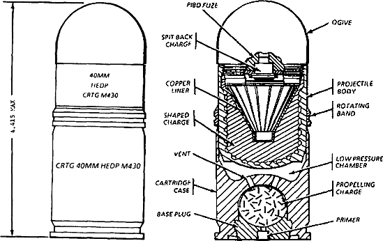 M430杀伤破甲两用弹(HEDP)在1970年由柯尔特公司研制生产,弹头结构与低速弹的M433弹相似,1970年代初开始装备美军,其后发展出M430I和M430A1等改进型,目前仍然是Mk19等自动榴弹发射器配用的主要弹种。该弹全长4.415英寸(112mm),重0.75磅(340g),主装药量38g,使用M553触发引信,保险距离18~30m,初速244m/s,最大射程2200m。M430能够击穿51mm均质钢板,而改进战斗部和药形罩的M430A1能够击穿76mm均质钢板。