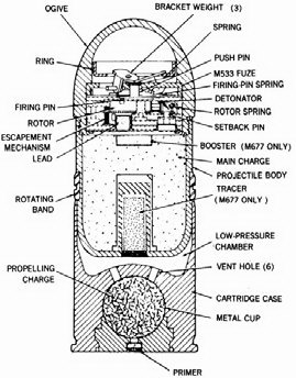 M677高爆弹在弹底一个金属管内有曳光剂,由发射时的火药燃气点燃延时药,延时药燃烧时间约0.07~0.16秒,即在榴弹飞离膛口约18~36m左右开始点燃曳光剂,提供肉眼可视的弹道指示功能。M677曳光高爆弹长4.415英寸(112mm),重0.75磅(340g),使用M553触发引信,初速244m/s,最大射程2200m。