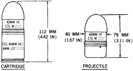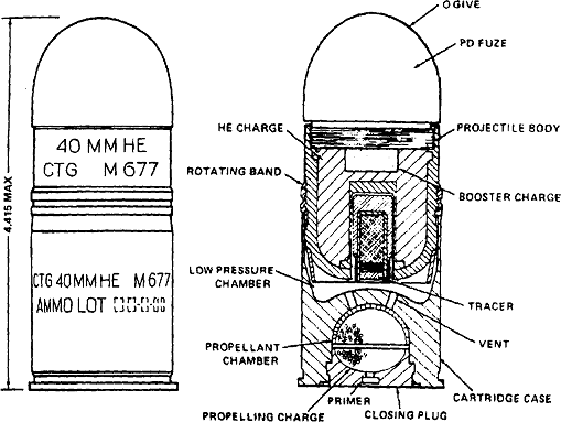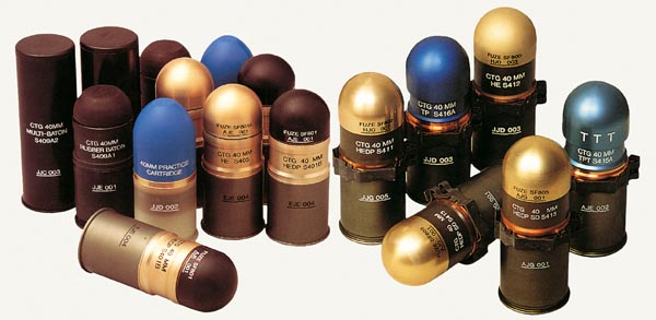 40mm的高速榴弹与低速榴弹在外形上很相近,只是高速榴弹的弹壳长一些,但全弹长却不一定是高速榴弹长,因为有些低速榴弹的弹头更长