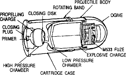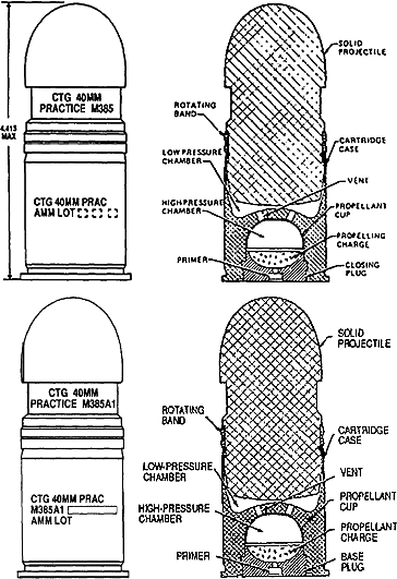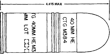 M383和M383E1高爆弹虽然在发射原理上和40×46mm低速弹相同,但结构有很大区别,除了弹壳结构不同外,弹体也不相同,作为机载武器,除了要有更大的射程外,还追求更大的杀伤效果,因此M383的战斗部不是球形,而是装药更多的柱体,其杀伤半径达15m。M383高爆弹长4.415英寸(112mm),重0.75磅(340g),使用M553触发引信,初速244m/s,最大射程2200m。