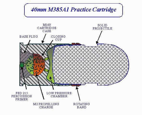 M385和M385A1训练弹全长4.415英寸(112mm),重0.76磅(350g),弹头由蓝色粉末粘结而成,撞击目标后粉碎形成蓝色烟尘效果。