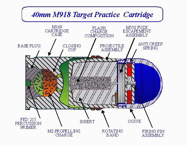 M918训练弹全长4.415英寸(112mm),重0.76磅(350g),使用M550引信,弹体内有闪光剂,撞击目标后燃烧产生闪光效果。