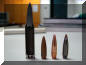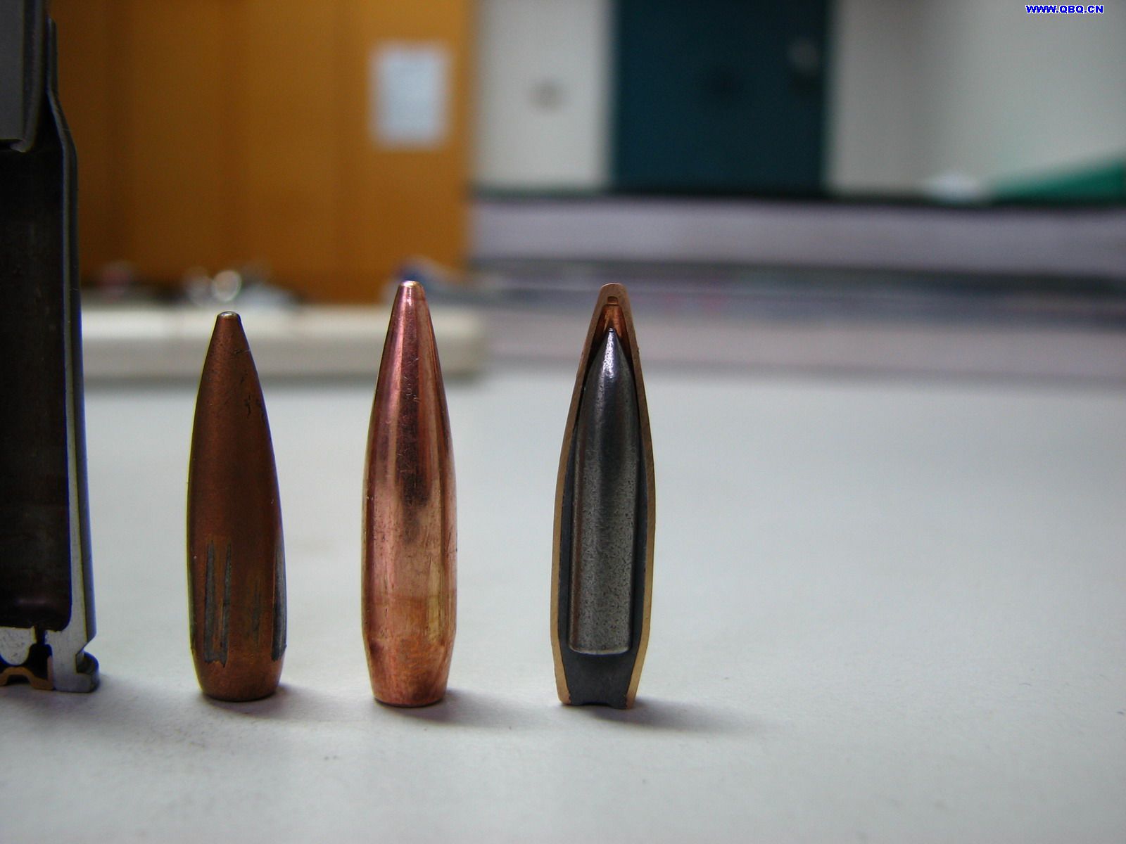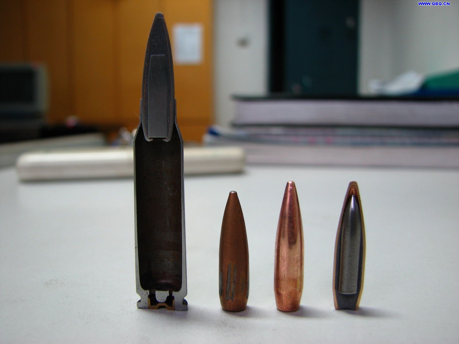 在网上搜刮来的照片,5.8mm弹头家族,从左到右分别为:曳光弹,重弹,轻弹,手枪弹和手枪弹的钢芯