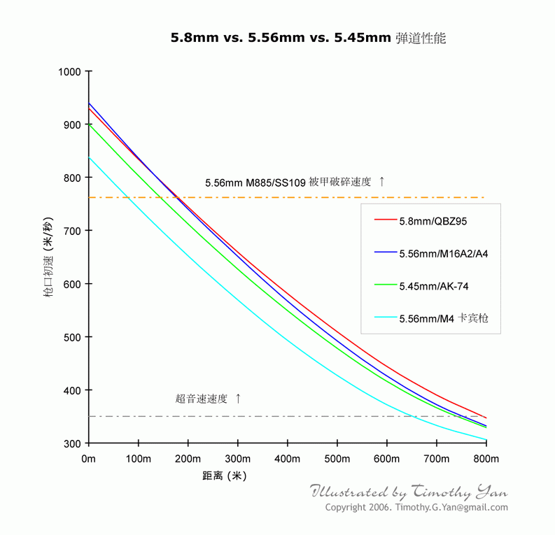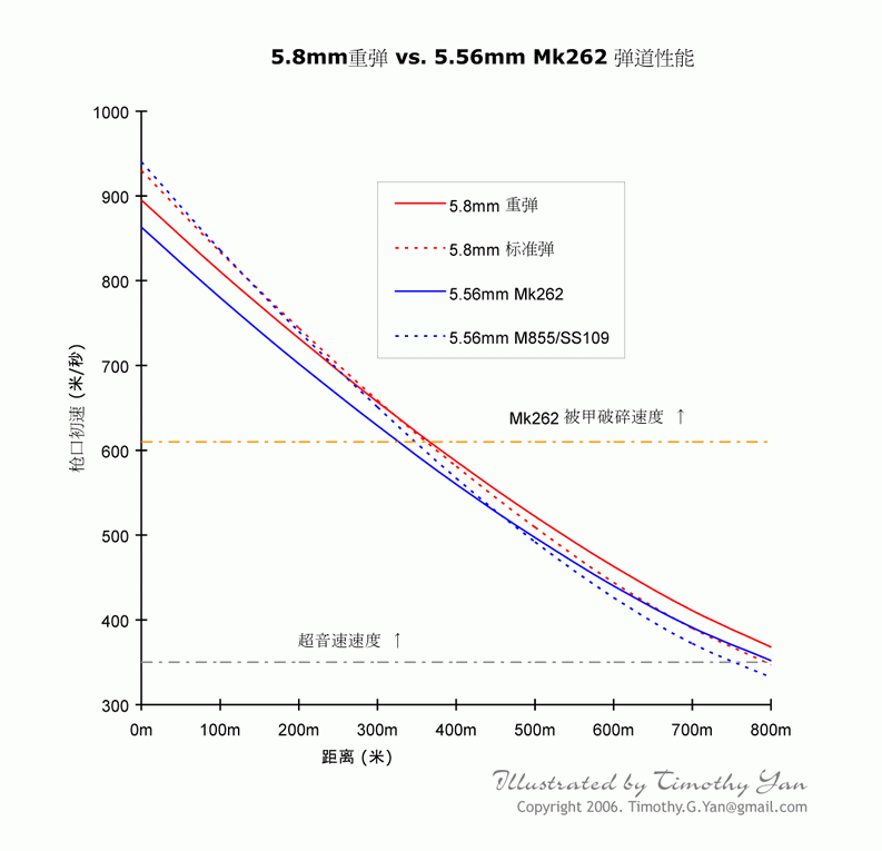 首先,DBP87弹在初速上高于SS109弹和7N6弹。增加弹头初速,能增大弹头的飞行距离,使弹道更加低伸;减少外界条件对弹头飞行的影响;增大弹头的杀伤力和对目标的贯穿能力。