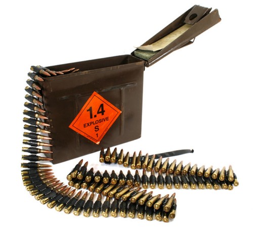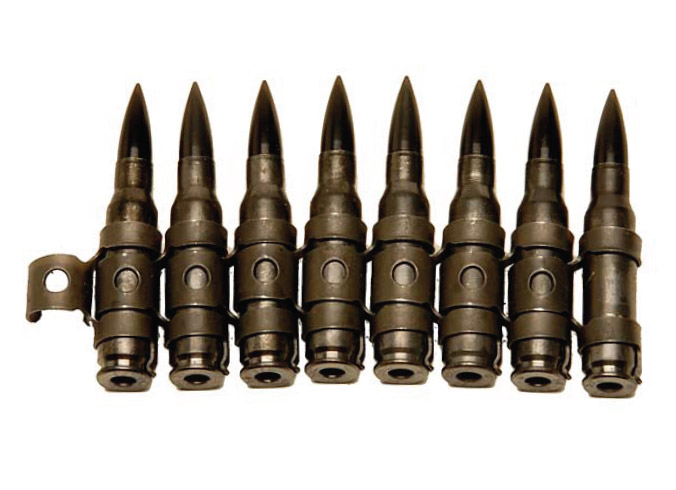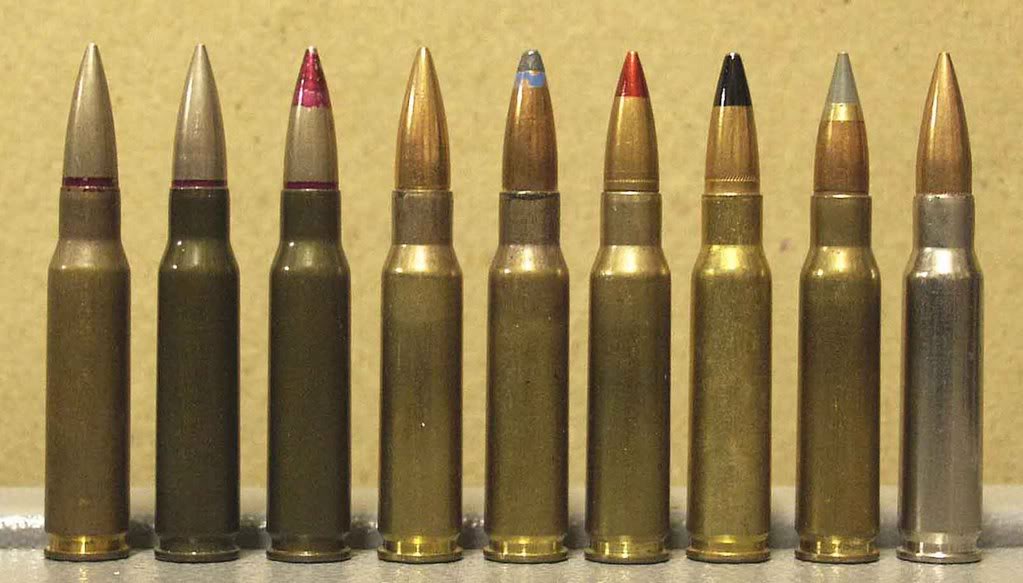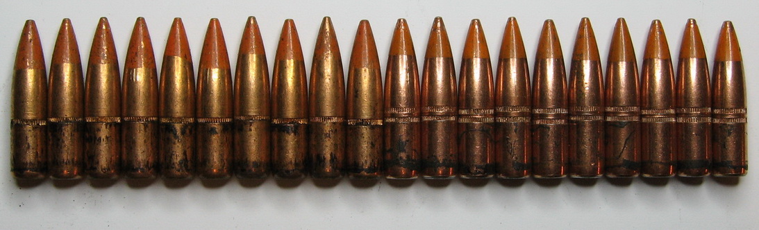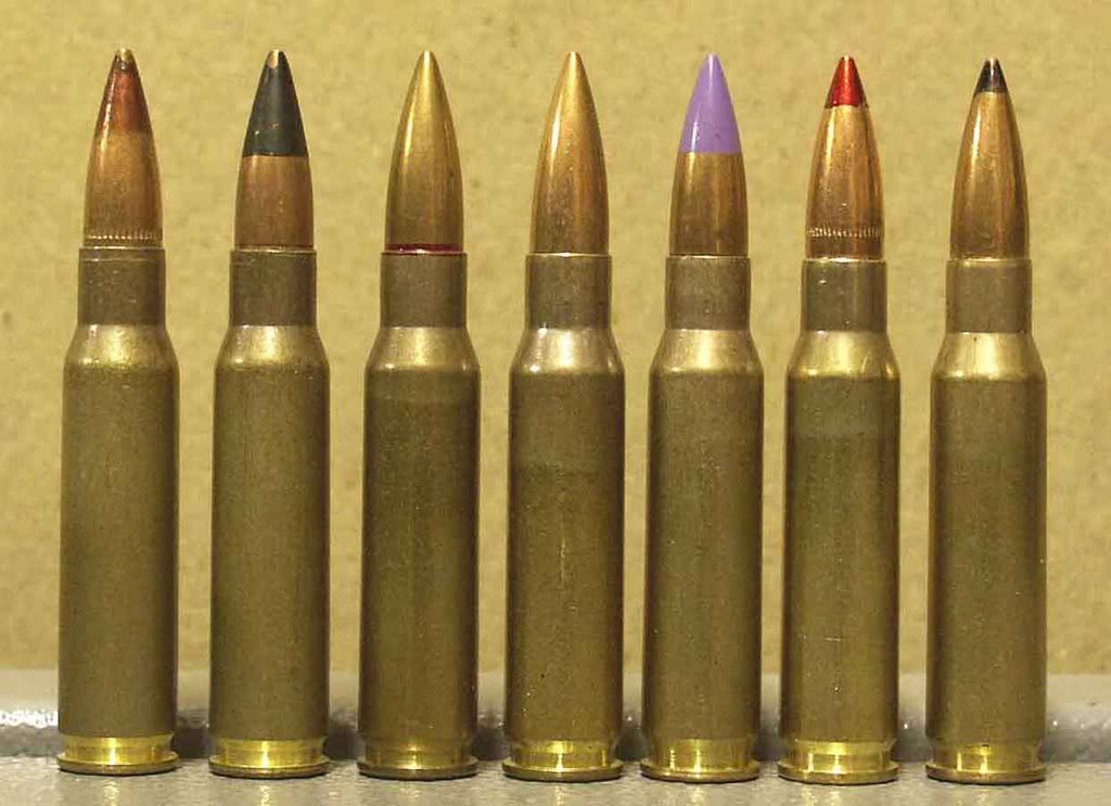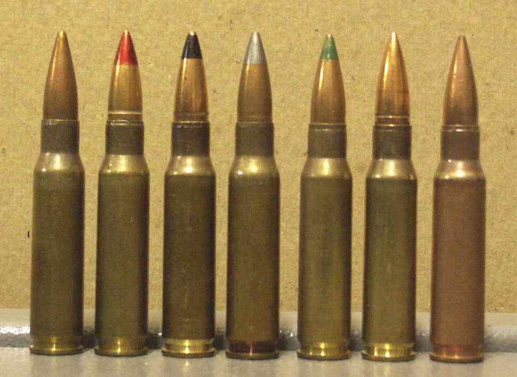 比利时生产的7.62×51mm弹药,从左到右:SS77普通弹、L78曳光弹、P80穿甲弹、PI86穿甲燃烧弹、SS123普通弹、L124曳光弹、高压测试弹