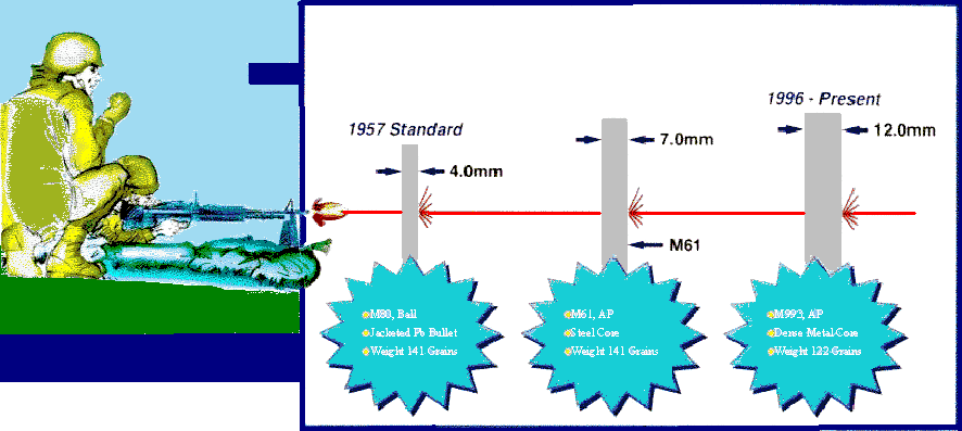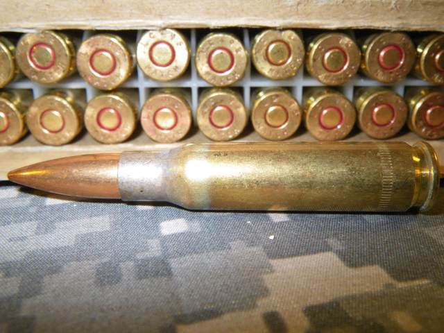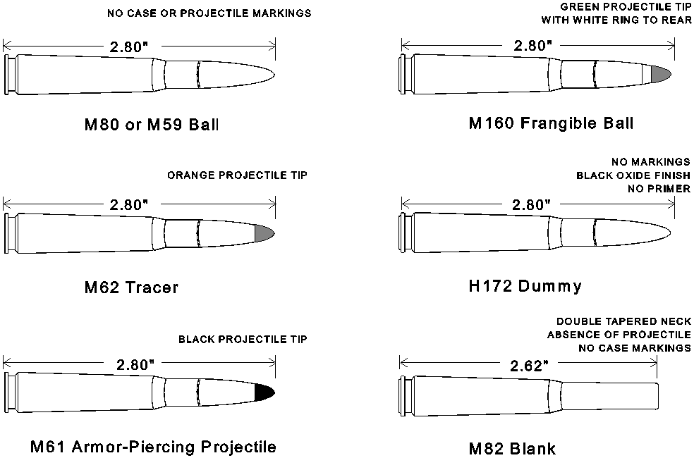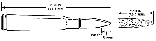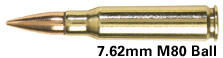 在美军,M80普通弹已经代替M59普通弹成为新的制式弹药,除了弹头外形稍有改变外,还把钢芯改为铅芯,但全威力弹的侵彻能力仍然比较大,在300米能击穿0.16英寸(4mm)装甲钢板,在500米能击穿0.12英寸(3mm)装甲钢板。该弹弹尖没有任何识别标记。
