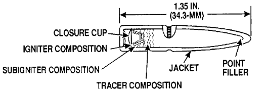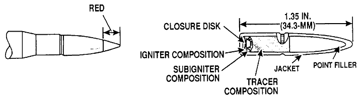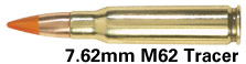 M62曳光弹,可用于弹道观测和发射信号,并能对易燃物产生纵火效果,在机枪弹链上,通常隔4发普通弹就会有1发曳光弹。作为识别,在M62的弹尖上有橙色标记。