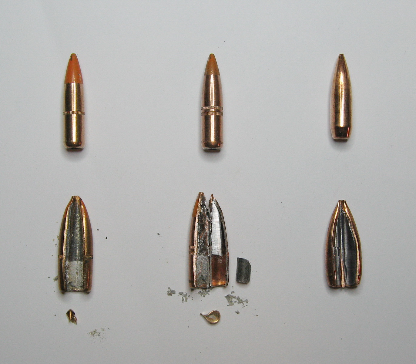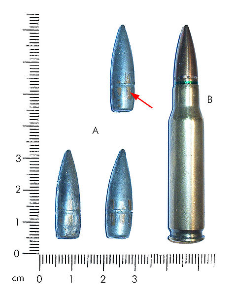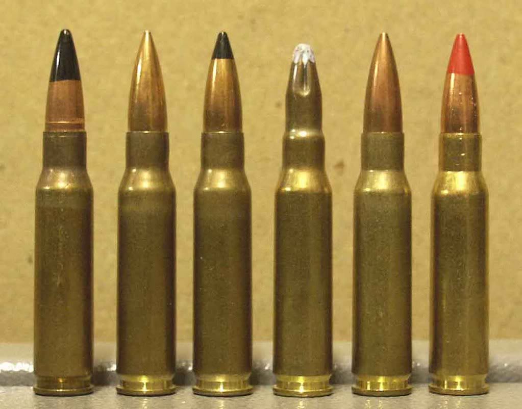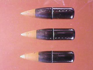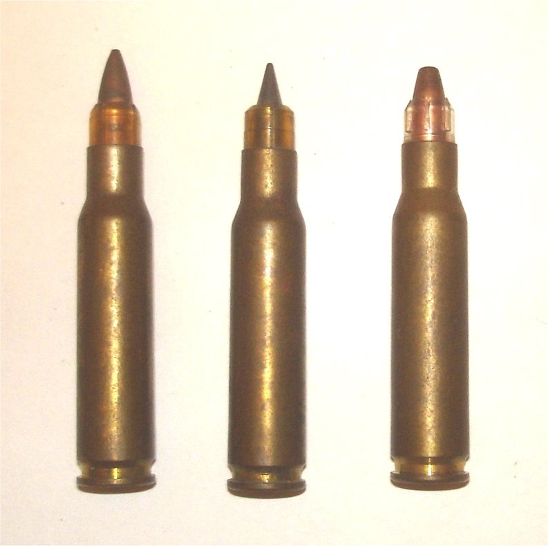 从左至右:M62曳光弹头、旧M80弹头、M80A1弹头
