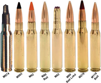 7.62mm NATO口径有多种型号,有多种类型的弹头和不同的弹道性能及目标效果,就算是普通弹也分别有钢芯和铅芯两种,而且虽然大部分7.62mm NATO弹都是黄铜弹壳,但也有个别国家采用钢弹壳。在下面的型号介绍中我也只介绍美军标准的型号,其他国家生产的各型枪弹在结构和性能上也略有差别,但基本上和美军的相应型号差别不大。至于民用的.308温彻斯特早已经不限于温彻斯特公司生产,同样有多种型号,不过民用弹的型号我这里也不一一介绍了。