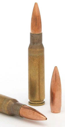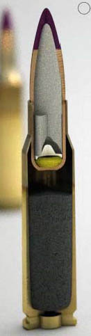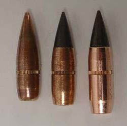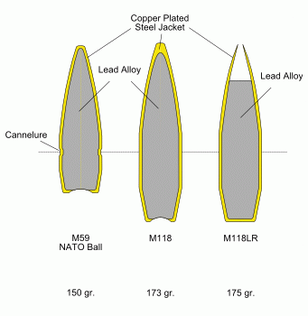 这是M118的改进型,LR的意思是“远程”,M118LR采用新的175格令尾锥结构空尖弹(BTHP),但弹尖的孔极小,实际上就是从后往前包被甲的新工艺,这种加工方式比起传统的从后方将弹芯挤入被甲的方式可以减少铅芯的形变,可获得更好的一致性,从而提高射击精度。现在这类弹头结构又被取名叫开尖弹(OTM)。