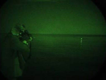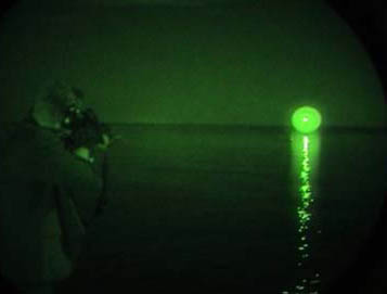 用夜视装置拍摄曳光弹的效果,左图是标准曳光弹,右图是红外曳光弹