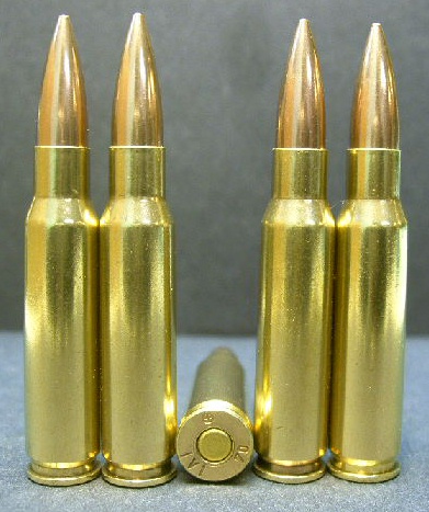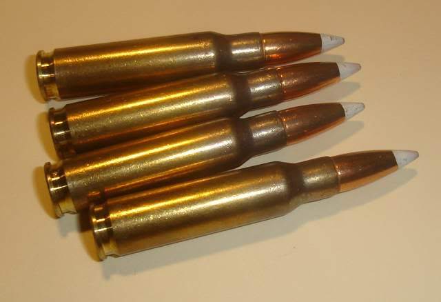 ![]() 从左到右:9.3×62mm、.30-06、8×57mm IS、6.5×55mm和.308温彻斯特 |