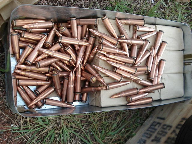 枪弹包装是枪弹出厂前的最后一个工序,虽然这与枪弹制造本身没有太大的关系,但对枪弹长期储存性能还有运输、使用的方便性有很大影响,所以绝不能等闲视之。56式枪弹和其它国产军用枪弹一样,通常采用铁皮匣加木箱的包装方式,每个木箱内装两个铁匣。我国生产的56式普通弹分为带桥夹的与不带桥夹的两种,带桥夹的是将枪弹装在10发桥夹上,再以牛皮纸包装成30发一包,然后装入铁匣,每匣550发,每箱1100发,不带桥夹的是将枪弹每20发或25发分装成一个纸包,再装入铁匣,每铁匣720发,每箱1440发。包装枪弹的铁匣一般用0.5毫米厚的镀锌薄钢板以双层咬合工艺制成,早期的铁匣开启时必需用随附的“钥匙”,较为不便,后期铁匣开启方法则有多种改进。枪弹包装木箱用木材和胶合板(早期的全部用木材)以突笋咬合成型,再加钢钉固定,箱体表面印字,内容包括枪弹型号、名称、材料、数量、发射药批次、毛重等等。装箱后枪弹的包装工序全部完成。而象《战争之王》那样把枪弹全部散放在木箱内的做法显然是不科学的,因为枪弹相互间的摩擦和磕碰会将弹壳表面的防锈材料磨掉,容易锈蚀,或者造成弹壳变形和弹头松动,同时也不利于防潮和长期储存。
