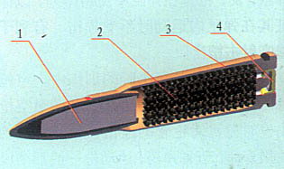 图3:覆铜钢弹壳56式普通弹剖面示意图:1-弹头;2-发射药;3-弹壳;4-底火