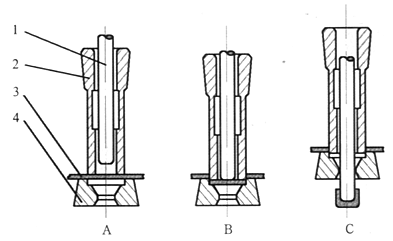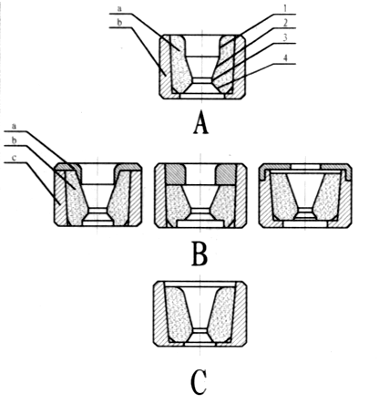 多模引伸工艺生产弹头壳时常用的三种引伸模具:A模为带导向部分的整体模,其中a为内模、b为外模,内模又可分为4个部分(1为导向部分,2为锥形部分,3为圆柱部分,4为底部倒锥部分),内模一般用硬质合金制造,外模用工具钢制造。 这种模具结构简单,适用于上模也可用于下模;B模为带有导向部分的组合模,其中a为导圈,b为内模,c为外模,导圈用于代替模A的导向部分,其特点是加工比较简单;C模为不带导向部分的模具。用于引伸的中模或下模。 |