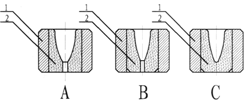 弹头壳生产中常用冲尖模具(1为外模,2为内模)。A模为一次冲尖模,B模为末前次冲尖模,C模为末次冲尖模。一般的枪弹弹头壳只用A和C两种冲尖模即可,但是有时为了保证弹头尖部的弧形尺寸,还要用到B型冲尖模。A、B模顶部有小孔,利于润滑液和空气排出,保证弹尖部尺寸。冲尖过程中最容易发生的故障是冲穿毛坯,这与材料的塑性、模具和冲头的设计以及一次加工变形量大小有关。所以在第一次冲尖时,冲头尖部的圆弧半径比较大,且冲尖的高度不高,可以有效避免冲穿毛坯。 |