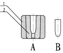 56式普通弹弹头生产中使用的钢心冲形模。其中A为冲形模,B为冲压成形的钢心,1为模套,2为内模。模套一般用工具钢制造,内模用硬质合金制造。 |
