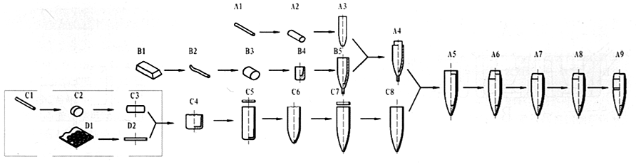 56式普通弹头生产和装配过程。其中A1→A3为钢心加工过程,B1→B5为铅套生产过程。A4为钢心压入铅套,C1→C3为用圆钢下料制造弹头壳的过程。D1→D2为用覆铜钢板制造弹头壳的过程,C3→C4为挤盂,D2→C4为冲盂,C4→C8为弹头壳加工成型过程,A5→A9为弹头装配成型过程。 |