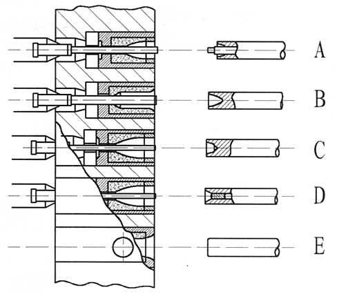 弹头装配组合模具示意图: A、终压工序; B、尾锥部预压; C、尾部卷边; D、尾锥成型工序; E、弹头过径。 过径后的弹头即可送去辊紧口沟。 |