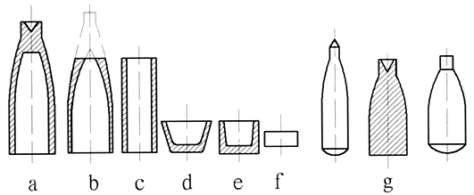 弹头常用各种铅件外形图:a-普通弹用铅套;b-穿甲燃烧弹用铅套(图中实线部分为成品形状,点划线部分为加工成形后切除的部分);c-特种弹用铅套;d、e-特种弹中使用的铅碗;f-铅垫;g-各种不同的弹头铅心。 |