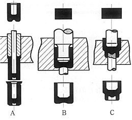 钢件冷挤压工艺种类示意圈。其中A-正挤压,B-反挤压,C-复合挤压。正挤压,其金属流动的方向与冲头方向相同;反挤压正好相反,其金属流动的方向与冲头方向相反;复合挤压为以上两种方法的综合应用。在弹壳的生产中基本上都是采用反挤压方法来制造钢盂,优点是挤压力小、成型精度好。 |
