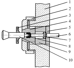采用深冲优质碳素钢生产弹壳钢盂的挤盂示意图。 1-模座;2-螺帽;3-退货卡子;4-挤盂模;5-挤盂模垫铁;6-顶杆;7-挤盂模底冲;8-钢盂;9-挤盂模底垫;10-挤盂冲。 |
