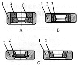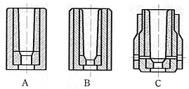 弹壳生产常用引伸模具可分为A、B、C三大类。 A中1-模套,2-导圈,3-内模,这种引伸模多用于上模; B中1-模套,2-中套,3-内模; C中1-模套。2-内模。 B模和C模一般用于下模,引伸模内模一般用硬质合金制造,其余一般用碳素工具钢制造。 |
