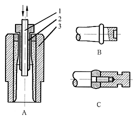 弹壳收口模和拉口冲示意图。A为收口模具组合,其中1-退货顶杆,2-收口冲,3-收口模具,根据收口冲是否运动,还可以分为固定式收口冲和非固定式收口冲两种(图中为固定式)。前者弹壳口部内径由收口冲来保证,且收口后口部的壁厚不减薄,其优点是工具损伤小,使用寿命长,模具结构和机床运动比较简单。一般在大口径弹壳上应用比较多。 B、C为拉口冲,其工作过程是拉口冲先进入模具内。待弹壳收口完成后再从弹壳口部拉出,由于冲头上有一端直径比较大。在拉出后会将弹壳口部壁厚减薄,这种加工方法的优点是口部的内径和壁厚比较均匀,内壁的光洁度较高,多用于中小口径步枪弹。 |