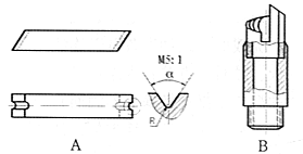 弹壳生产所用的两种齐口车刀。其中A为菱体形,制造简单,使用方便,一般使用高速钢制成,多用于中小口径枪弹弹壳的加工;B为简形,结构比较复杂,多用硬质合金制成,主要用于大口径枪弹弹壳的齐口加工,其加工端面的质量较好。刀头也比较耐用。 |