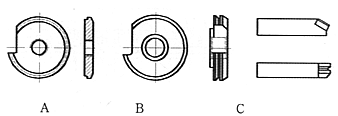 弹壳生产所用的三种车底成形车刀。其中A和B为圆盘成形刀,A多用于小口径枪弹弹壳。B用于大口径枪弹弹壳;C为菱形成形刀,也用于大口径枪弹弹壳。 |