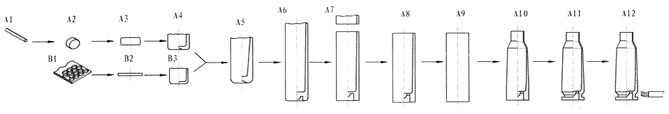 弹壳生产各个工序加工变形示意图。A1→A4为用深冲优质碳素钢棒材料加工钢盂的变形过程,B1→B3为用覆铜钢板制造钢盂的加工变形过程,A5→A12为钢盂加工成弹壳的过程。其中A5-一次引伸,A6-二次引伸、打凹。A7-切口或挤口和压底,A8-冲传火孔,A9-烧口,A10-收口,A11-车底和齐口,A12-弹壳表面处理。 |