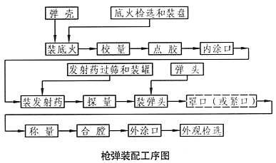 国产56式步枪普通弹的装配过程一般可以分成两大部分,第一步是装底火、校量、点胶和内涂口,第二步为装发射药、弹头以及弹头的紧口等,接下来才是对枪弹的校量、检验、密封和检选。枪弹装底火一般是在上底火组合机床上完成的,这种设备可以连续完成装底火、校量、点胶和内涂口工序。装底火的深度根据选择基准不同而有一定区别,有的是用弹壳底缘厚度定位,装底火的精度取决于弹壳底缘加工的精度,另一种是以底火冲和装底火模具来定位的,精度取决于冲头和模具的精度,相比较而言后一种方式精度更高,国产56式普通弹即采取后者。底火装完以后需要对装入的深度进行校量,剔除装入过深或过浅的弹壳,校量的方法包括机械校量和电校量,前者仍是杠杆放大原理,后者则是利用冲头相对电磁铁的位移来校量底火装入深度的。校量完的弹壳在底火与弹壳之间涂布密封漆,称为“点胶”,目的是使枪弹长期储存不至于受潮变质。其方式有两种,一种是在底火表面全部涂漆,另一种只是在底火与底火室接缝处涂漆。前者工艺设备简单,缺点是浪费漆液,而且有时漆会流至弹壳体部、影响外观,另外有时脱落的漆膜会堵塞枪械的击针孔,因此国产弹多使用后一种方式。密封漆一般选用防腐漆、硝基清漆或防腐漆和虫胶漆的混合物,有时为区分弹种还要将漆染成不同的颜色,如国产56式曳光弹底火部分全涂绿漆,普通弹根据生产厂家不同密封漆的成份和颜色也各不相同。底火点胶后弹壳即被送去内涂口,其目的是保证枪弹的密封性,防止水份从弹头和弹壳的结合部位渗入使发射药和底火变质。其方法是在弹壳口部内壁涂上一层特制的具有一定粘性的沥青漆,宽约2~4毫米,弹头装入弹壳时,受到弹头底部的挤压,在弹头底部与弹壳内壁四周形成一个致密的密封圈。内涂口后一般要将弹壳晾一段时间,以使漆膜表面变硬,不至于粘挂发射药药粒,同时又不能完全干透,否则就不能形成完整的密封圈。经过以上各工序的弹壳,经检验合格后送往成弹装配车间。