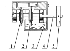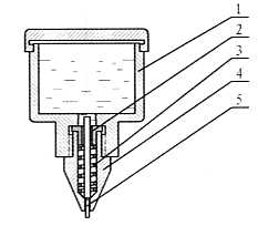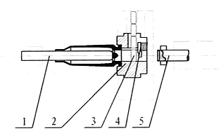 枪弹底火全点胶工具示意图。1-胶盒;2-点胶嘴盖;3-弹簧;4-点胶嘴;5-点胶冲。具体点胶的过程为装有底火的弹壳向上由机床上的工具带动进入点胶工位,胶壶下降,点胶冲受到底火的挤压被压回,漆液即流到底火上和底火周围。 |