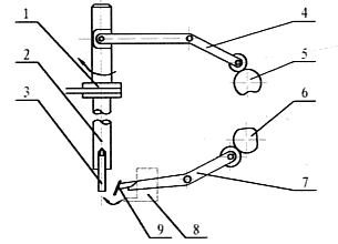 枪弹底火周围点胶工具示意图。1-皮带轮;2-主轴;3-点胶冲;4、7-摆杆;5、6-凸轮;8-胶盒;9-胶刷。其工作原理为:皮带轮1带动主轴旋转,主轴头部有个环状点胶冲3,同时凸轮5使摆杆4带动主轴上下运动,另一个凸轮6使摆杆7摆动,当摆杆往下时胶刷9在胶盒8中蘸漆,当摆杆往上运动时胶刷把胶刷在点胶冲上,当主轴向下时点胶冲即在弹壳底火周围点胶。 |