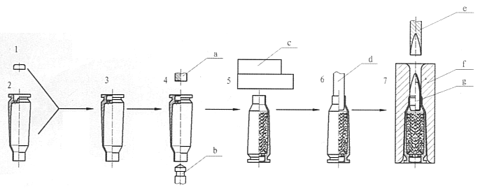 枪弹装配步骤示意图。1-底火;2-弹壳;3-压装好底火的弹壳;4-点胶和内涂口工序(a-点胶冲,b-内涂口冲);5-装药工序(c-药门);6-探药工序(d-探药冲);7-装弹头及罩口工序(e-装弹头冲,f-装弹头模,g-弹头) |