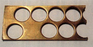 黄铜弹壳底部的加工流程与文中所述基本类似。从左至右分别是:经过二次引伸的铜盂、打凹、平底并冲底火室、冲传火子L、车底、装入底火