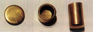 黄铜弹壳制造时的初始步骤。从左至右分别是:下料后的圆板、首次冲盂形成的铜盂、一次引伸后的铜盂