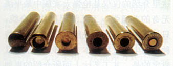 下一工序为校量,这也是弹壳生产中重要的一道关口,对弹壳重要尺寸一般要进行100%校量,剔除不合格品,对于可修复的超差品,经返工、检验合格后与同批弹壳发往下道工序。56式弹壳采用递进式校量机校量,可通过机械放大的原理对弹壳长短、底缘直径、火台深度、底火室直径、底缘厚薄、口部直径和全形大小等9个尺寸依次进行校量。合格弹壳还需要一道光电检孔的工序,目的是剔除没有传火孔或传火孔堵塞的弹壳。对校量合格者,如果是覆铜钢弹壳,还要对弹壳拉壳钩槽进行磷化和涂漆,如果是钢弹壳,则在磷化后进行电泳涂漆。完成以后即进入外观检选工序,与弹头检选操作和方法一致,也是通过检选机带动,然后手工检选。至此弹壳的全部加工方告结束,但还要对弹壳的各个方面尺寸和射击性能进行全面抽验,如果发现问题,则需加倍复验,验收合格的弹壳才可转入成弹的装配。经过这样复杂的生产过程后,仅仅得到了合格的弹头和弹壳,下面才能进行全弹的装配,绝不象《战争之王》开头所表现的那样,只经过简单的几步就形成了一颗成品枪弹。