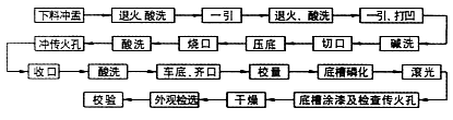 国内目前采用的由两种不同材料生产弹壳的工艺路线如图12和13所示,图12采用覆铜钢板,图13采用深冲优质碳素钢棒。图中可以看出前者生产工艺要简单一些,但是覆铜钢价格相对较贵,且都为板材,利用率比较低,不仅仍需消耗铜,而且很难回收再利用。采用深冲优质碳素钢棒材料的生产工艺虽复杂,且对模具和机床的要求比较高,但不用铜,材料廉价且利用率很高,经济性好,更适合国情。