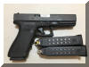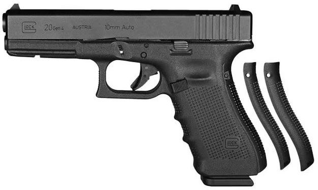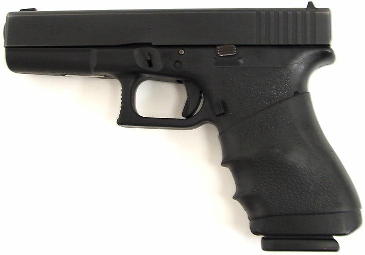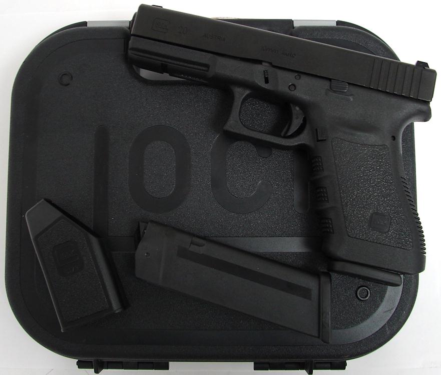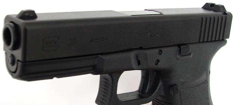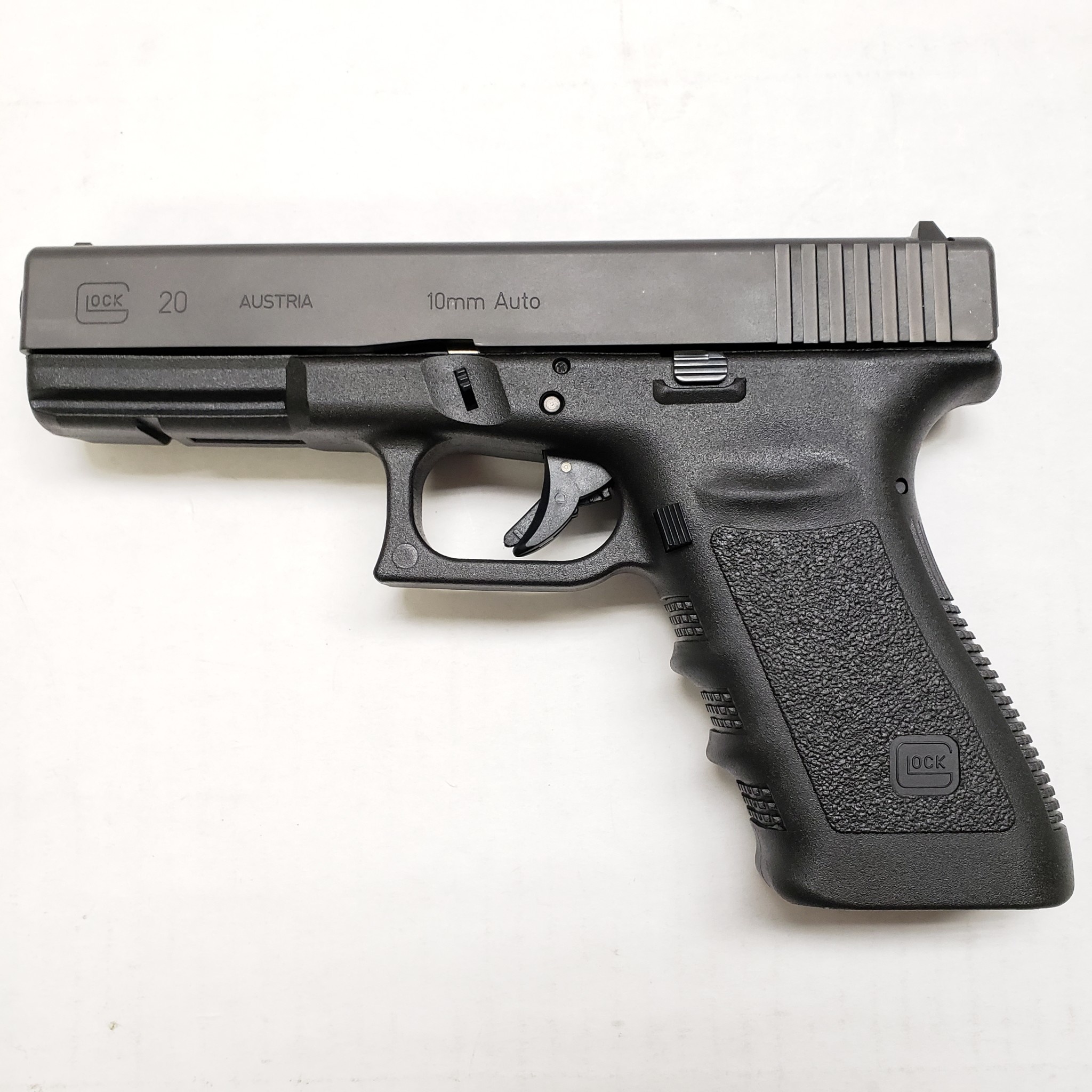 Glock 20是专门针对美国警用和民用市场设计的,1990年首次在美国拉斯维加斯的SHOT SHOW上展出。Glock 20发射原本为FBI研制的10mm AUTO手枪弹,由于枪弹直径和长度都比较大,因此整个底把都加粗加长。由于枪弹威力增大,因此在扳机钩上方加了一个横向销钉(如下图所示),防止射击时闭锁块移动。在其他发射大威力手枪弹的Glock手枪型号中都有类似的设计。第三代的Glock 20也生产有顶端开孔的“C”型,但在第四代推出了,因为高效的复进簧缓冲装置,所以不再生产Glock 20C。Glock 20的双排弹匣容量为15发,但针对某些地区的法律限制,也有供应专门的10发容量弹匣。