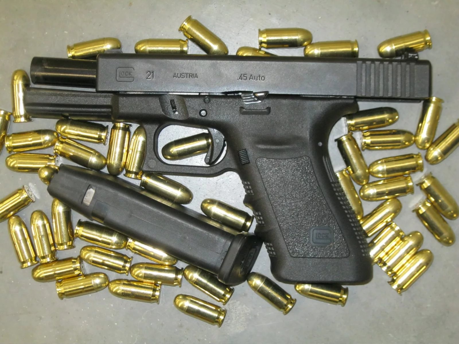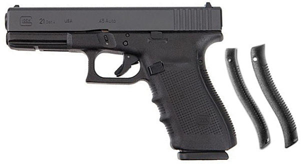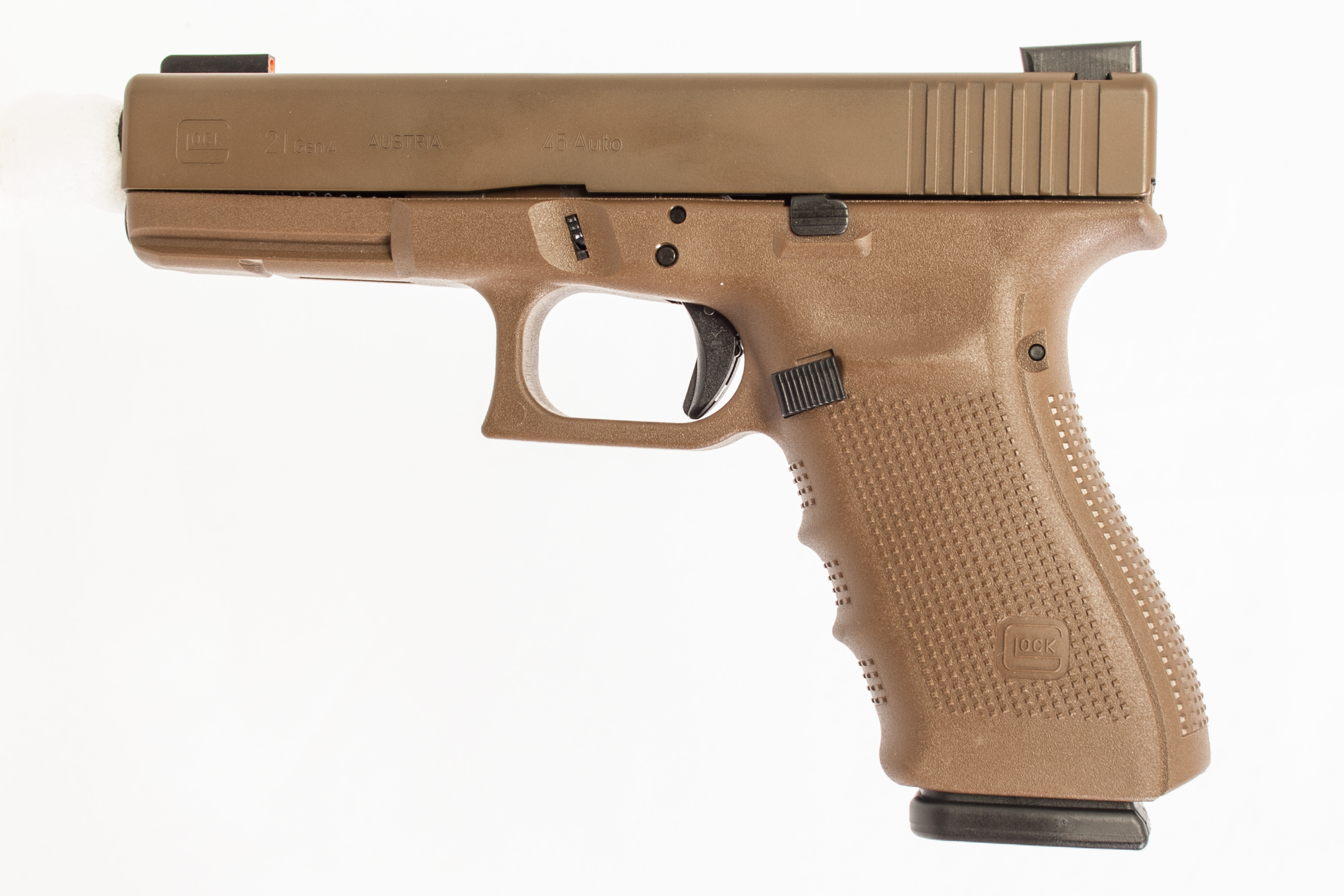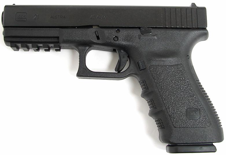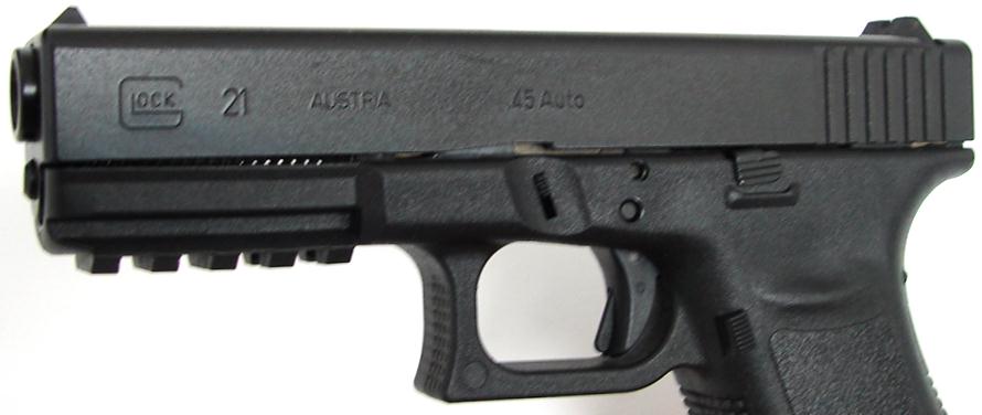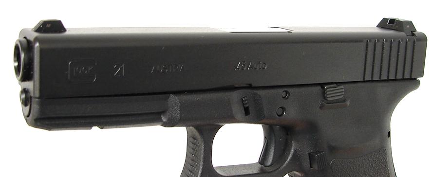 在1990年与Glock 20同时在拉斯维加斯SHOT SHOW上露面的还有发射.45ACP手枪弹的Glock 21手枪,虽然握把厚,但由于底把是由工程塑料整体制成的,握把上不需要侧片,因此握围仍然控制在合理的尺寸内。在没有广泛采用工程塑料技术以前,同样是.45口径的手枪要达到13发这样的弹匣容量是不容易的。由于这种口径的手枪主要针对美国市场,在1994年颁布防止突击武器法后,格洛克公司推出了10发容量的Glock 21弹匣。