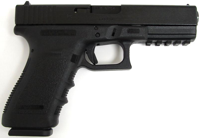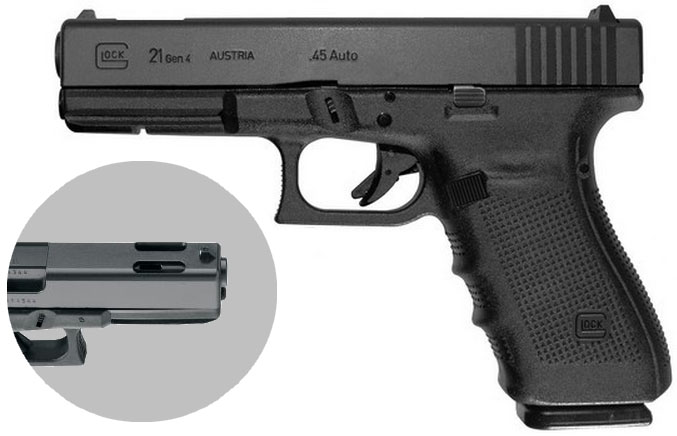 改装过的GLOCK21,在枪管顶部开了5上抑制枪口上跳的泄气孔,并在扳机护圈前增加了激光指示器。