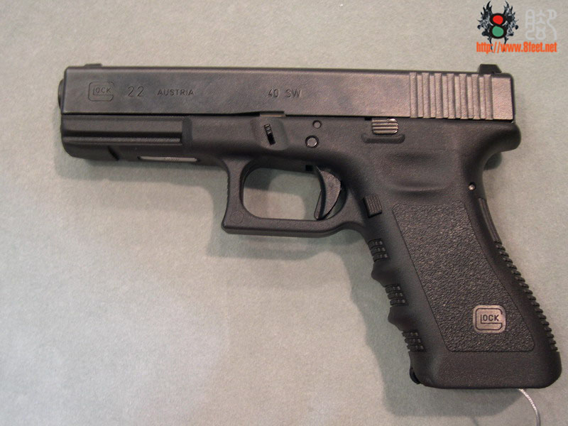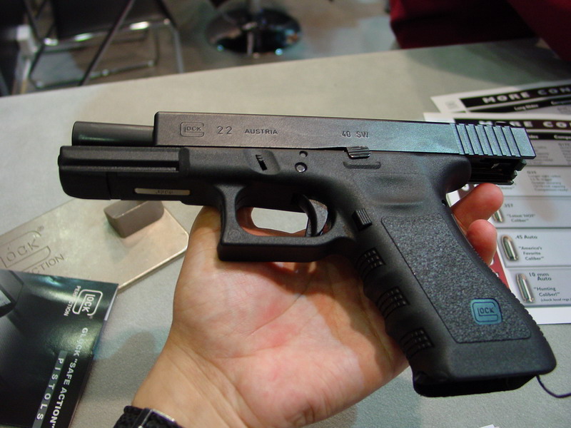 2004年6月底在北京举行的第二届中国国际警用装备博览会(CIEPE)上展出的GLOCK22(感谢八脚提供的照片),由于是新生产的型号,因此底把上有导轨