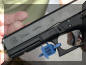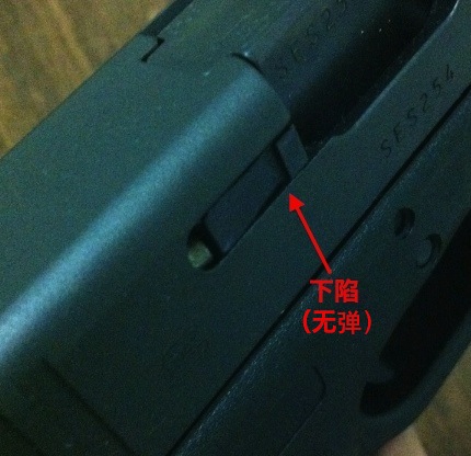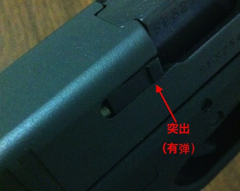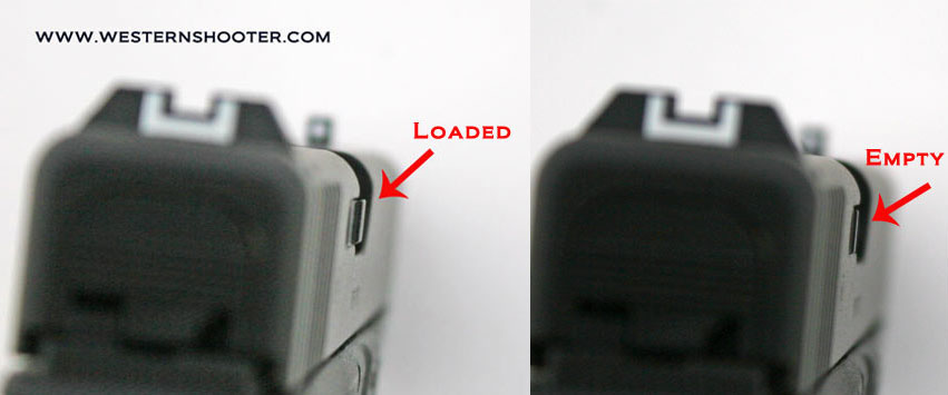从后方观察膛内有弹指示的形状:左边是膛内有弹,右边是空膛。虽然这把示范的是第4代Glock,但在第3代上的效果是一样的