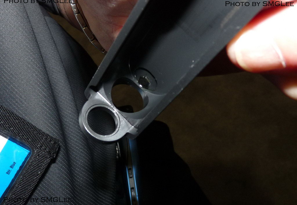 Glock的抽壳钩同时也起膛内有弹指示器的作用,空膛时抽壳钩是整个陷进去的;而上膛后抽壳钩是突出的。有经验的用户摸一摸抽壳钩就知道是否上膛,如果摸到那个突起来的小方块,证明已经上膛了,反之,如果很平滑什么都摸不到的话,证明没有上膛。(@Jack Winner提供)