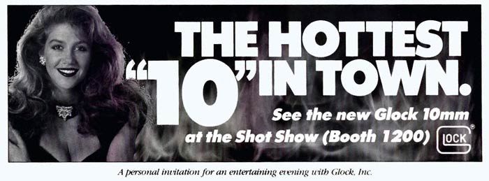 GLOCK在自家地盘,印证了广告业铁律Sex Sells之后,再接再厉,聘请Gold Club当家舞娘Sharon Dillon担任枪模。为了增加一点专业气氛,还安排她先上足四天GLOCK课程。班上其它学员均是男性军警界人士,对于美女出现,自然十分好奇。GLOCK公司教官一律以无可奉告做为回答。Sharon在班上的表现也令人跌破眼镜,不论纸上课程或实际射击成绩均佳。众同学认为她是秘密受训的CIA情报人员。