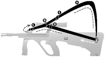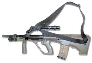 AUG标配的背带是传统的两点式,但也可以安上其他的三点式战术背带