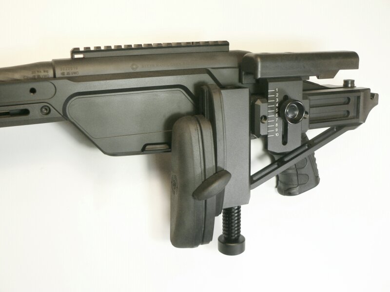 因为要改为可折叠的枪托,所以SSG 08设计了手枪型握把。枪托材料为航空铝材,枪托可调整贴腮板高度、托底板长度以及柱锄的高度。固定贴腮板的铝板上有刻度线,从1到10共10个档位,通过枪托右侧的旋钮调节高度,找到最适合射手自己的贴腮位置。托底板的橡胶垫在右侧的旋钮松开后可以上下调节,也可以更换不同长度的橡胶垫来满足不同人群的LoP(Length of pull,托底板到扳机的长度)。位于枪托尾部下方的柱锄也可通过旋转调节长度。枪托在不使用时可折叠在枪身左侧。手枪型握把的前后垫板可更换成不同厚度的部件,以适应不同人的手掌大小。