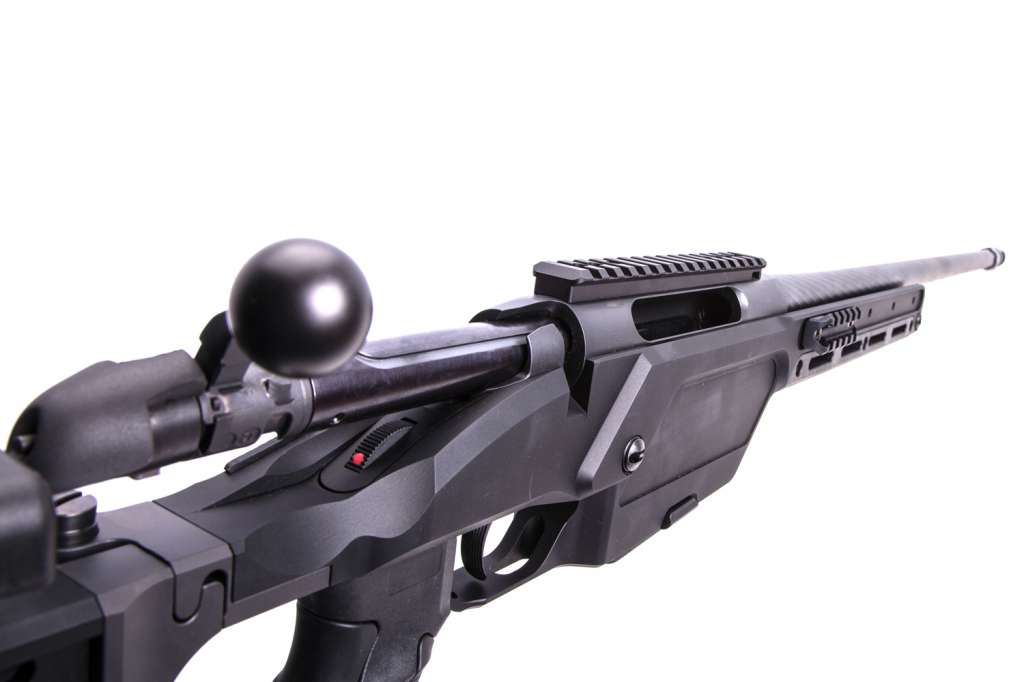 铝合金底座一直延伸至护木,7075-T6航空铝切削的机匣通过安装在底座上,顶部有段STANAG 4694导轨(皮卡汀尼导轨的北约标准规格,而在北美市场上出售的则是MIL-STD-1913规格)用于安装瞄准镜,在导轨最前端刻有“20MOA”字样,意思是该导轨的预设倾角值为20个MOA,提示射手在安装瞄准镜时预设的倾斜角度有多大。机匣右侧开有抛壳口,虽然该枪由双排弹匣供弹,但在单发慢射时也可以直接从抛壳口处装弹。